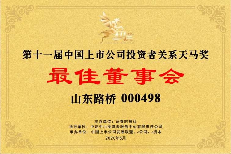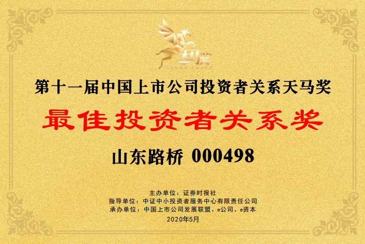 山東路橋第11屆中國上市公司投資者關(guān)系天馬獎(jiǎng)寄語,黨委書記、董事長王振江: 山東路橋堅(jiān)持生產(chǎn)經(jīng)營和資本運(yùn)作“雙輪驅(qū)動(dòng)”,發(fā)展質(zhì)量和效益增長“兩翼齊飛”。公司作為全國首批公路工程施工總承包特級(jí)資質(zhì)企業(yè),擁有施工“雙特級(jí)”和設(shè)計(jì)“雙甲級(jí)”等69項(xiàng)資質(zhì),先后參與全國三十幾個(gè)省市的路橋施工建設(shè),用一流的質(zhì)量樹立了信得過的“山東路橋”品牌形象。同時(shí),公司堅(jiān)持規(guī)范與發(fā)展并重,信披與治理并行,以“富員強(qiáng)企、通達(dá)天下”為使命,做讓投資者看得見、看得清的上市公司,打造基業(yè)長青的百年老店。未來,公司將充分把握高質(zhì)量發(fā)展契機(jī),不斷挖掘新的收入、利潤增長點(diǎn),走穩(wěn)健合規(guī)發(fā)展之路。扎根實(shí)體,練好內(nèi)功,突出主業(yè),弘揚(yáng)企業(yè)家精神和工匠精神,與投資者共享發(fā)展紅利。