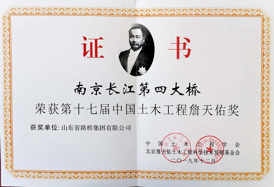 9月22日,在中國土木工程學(xué)會2020年學(xué)術(shù)年會暨第十七屆中國土木工程詹天佑獎頒獎大會上,山東路橋參建的南京長江第四大橋喜獲詹天佑獎,這是山東路橋第二次獲此殊榮。